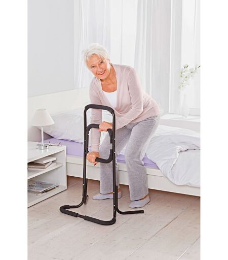 Rücken-, Hüft- und Kniebeschwerden sowie Verletzungen können alltägliche Bewegungsabläufe wie das Aufstehen und Hinsetzen erschweren. Damit Sie in diesen Situationen nicht auf fremde Hilfe angewiesen sind, gibt es praktische Alltagshelfer wie die mobile Aufsteh- und Sitzhilfe. Sie gibt Ihnen zuverlässigen Halt und unterstützt Sie, sicher auf die Beine zu kommen und sich kontrolliert hinzusetzen. Dank des geringen Gewichts von gerade einmal 1,5 Kilogramm können Sie die Aufsteh- und Sitzhilfe bequem überall dorthin transportieren, wo Sie ihre Unterstützung benötigen. Stellen Sie sie zum Beispiel neben Ihrem Bett auf, um morgens leichter und schneller hochzukommen oder sich abends sicher auf das Bett niederzulassen. Auch beim WC-Besuch leistet Ihnen der Alltagshelfer treue Dienste. Ebenso steht er Ihnen beim Aufstehen und Hinsetzen von Stühlen, Sesseln und Sofas zur Verfügung. Die Anwendung der Aufsteh- und Hinsetzhilfe ist einfach: Stellen Sie das aus einer robusten Metall-Konstruktion gefertigte Hilfsmittel neben oder vor sich hin. Die großen Füße und der Sturzbügel sind mit einem rutschhemmenden Material überzogen und sorgen auch auf glatten Untergründen wie Fliesen, Laminat oder Parkett für einen sicheren Stand. Halten Sie sich nun an den weichen, mit einer wasserabweisenden PU-Beschichtung überzogenen Handgriffen fest und ziehen Sie sich entweder aus dem Sitzen hoch oder lassen Sie sich langsam auf Ihr Bett, Ihren Stuhl oder Ihr Sofa nieder. Durch die in unterschiedlichen Höhen angebrachten Haltegriffe ist die Aufsteh- und Hinsetzhilfe für verschiedene Körpergrößen geeignet.Der clevere Helfer macht das Aufstehen und Hinsetzen so bequem, dass Sie ihn gar nicht mehr missen möchten. Müssen Sie auch nicht, denn durch ihr geringes Gewicht und die kompakten Maße lässt sich die Aufsteh- und Hinsetzhilfe problemlos mit auf Reisen nehmen. So müssen Sie auch im Urlaub nicht auf die Unterstützung verzichten. ...
