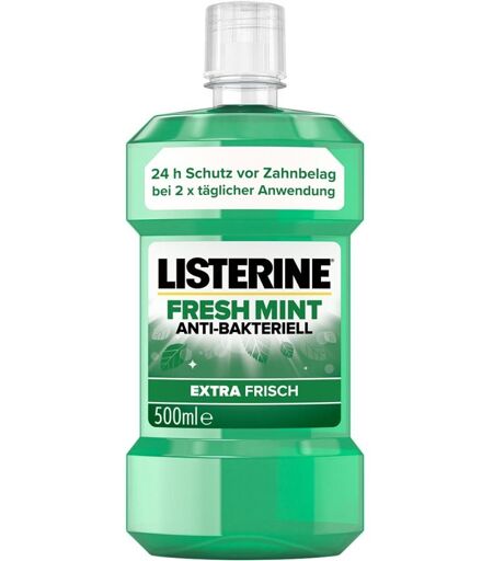 Anwendungsgebiet von Listerine Fresh Mint MundspülungBei zweimal täglicher Anwendung bietet Listerine Fresh Mint Mundspülung vor Plaque, sorgt für langanhaltend frischen Atem und tötet bis zu 97 % der nach dem Zähneputzen zurückgebliebenen Bakterien ab. Das antibakterielle Mundwasser reduziert und beugt Plaque vor, eine der Hauptursachen für Zahnfleischentzündungen, und erfrischt den Atem. Listerine Fresh Mint Mundspülung wirkt antibakteriell, ist klinisch getestet und hält das Gleichgewicht der Mundflora aufrecht.