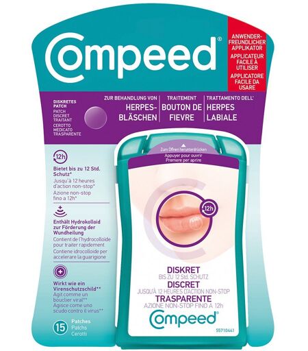 Die COMPEED® Herpesbläschen-Patch Vorteile im Überblick Schnelle Heilung bei Lippenherpes: Reduziert das Ansteckrisiko und deckt diskret ab. Kaschiert die Wunde, sodass sie nahezu unsichtbar wird. Make-Up und Lippenstift können wie gewohnt aufgetragen werden Schnelle Heilung und nachweislich verringerte Krustenbildung bei Herpesbläschen. Anwendung Waschen Sie sich vor und nach dem Gebrauch die Hände. Das Patch sollte auf gereinigter, trockener Haut angewendet werden. Tragen Sie keine Creme auf die Lippe auf, da das Patch sich sonst von der Lippe lösen könnte. Reißen Sie ein Produkt entlang der perforierten Kante ab, um es von den anderen zu trennen. Halten Sie den transparenten Folienapplikator am gekrümmten Ende. Mit beiden Händen ziehen Sie den transparentem Folienapplikator vorsichtig von der türkisen Schutzabdeckung ab. Sie sehen das runde Herpesbläschen Patch auf dem oberen Teil des Applikators. Vermeiden Sie den Kontakt mit der haftenden Seite des Patches. Mit Hilfe eines Spiegels legen Sie diesen Teil des Applikators auf das Herpesbläschen und drücken Sie ihn vorsichtig an, um das Patch auf dem Herpesbläschen zu fixieren. Ziehen Sie den Applikator vorsichtig ab und lassen Sie das Patch an seinem Platz. Make-up oder Lippenstift können über dem Patch aufgetragen werden. ...