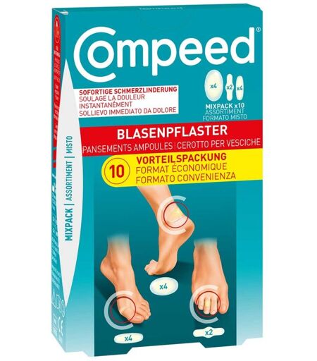 Anwendungsgebiet von Compeed Blasenpflaster MixpackEnthält für jede Blase das passende Pflaster: Compeed Blasenpflaster Mixpack ist die umfassende Lösung* für Blasen an den Füßen. Das Set für dich und die ganze Familie enthält unsere beliebtesten Blasenpflaster: 4 x das Compeed® Blasenpflaster Medium, 4 x das Compeed® Blasenpflaster Small und 2 x das Compeed® Blasenpflaster für die Zehen. Ideal für unterwegs und jedes Erste-Hilfe-Set.Compeed Blasenpflaster Mixpack können in Ihrer Versandapotheke www.apotheke.at erworben werden. ...