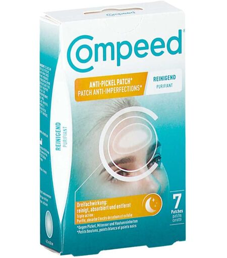 Anwendungsgebiet von Compeed Anti-Pickel Patch ReinigendCompeed Anti-Pickel Patch Reinigend reinigt, absorbiert und entfernt Unreinheiten, Pickel und Mitesser. Es lässt sich ideal über Nacht anwenden und beschleunigt somit die Heilung von Pickeln, Mitessern und Hautunreinheiten. Es stellt eine physische Barriere gegen Bakterien dar und hilft zu verhindern, dass sich der Pickel verschlimmert. Die Anwendung von Compeed Anti-Pickel Patch Reinigend ist für jeden Hauttyp geeignet.Wirkungsweise von Compeed Anti-Pickel Patch ReinigendCompeed Anti-Pickel Patch Reinigend verfügt über eine Hydrokolloid-Technologie, die in den Poren aktiv wird und überschüssigen Talg und Öl absorbiert und Hautunreinheiten entfernt. Compeed Anti-Pickel Patch Reinigend hat eine gezielte Wirkung auf große, zu Unreinheiten neigende Hautbereiche und entfernt sanft die hartnäckigsten Pickel. Wirkstoffe / Inhaltsstoffe / ZutatenCompeed Anti-Pickel Patch Reinigend enthält: