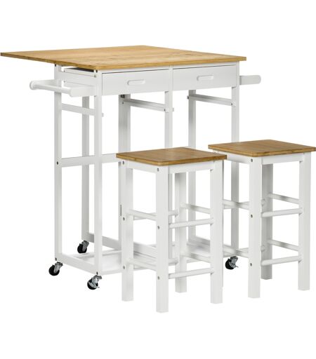 HOMCOM Ensemble Bartisch Küchenwagen klappbarer Küchentisch Rollen + 2 Hocker Weiß und helles Holz - 2 Schubladen und Geschirrtuchhalter