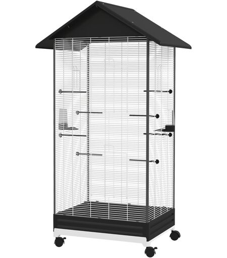 PawHut Vogelkäfig auf Rädern, freistehender Innen-Voliere für Vögel, mit herausziehbarem Tablett, 2 Futternäpfen und 8 Sitzstangen, für Finken und Kanarienvögel, 79 x 65 x 155 cm, Stahldraht, Schwarz