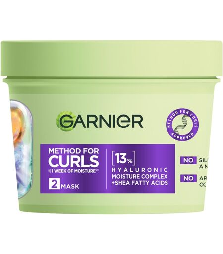 Perfect for reviving curls and coils, the Garnier Method For Curls Mask intensely nourishes hair to restore the appearance of bounce and volume. Powered by a 13% hyaluronic acid moisture complex and shea fatty acids, the hair mask helps to lock in moisture and enhance shine - all without weighing curls down. Curls appear bouncier and springier after use. ...