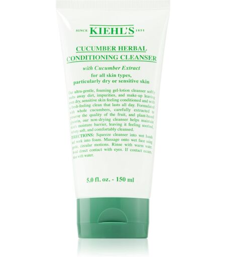 Kiehl's Cucumber Conditioning Cleanser, 150 ml, Gesichtsreinigung für Damen, Bevor man mit der Hautpflegeroutine beginnt, sollte die Haut perfekt gereinigt werden – denn ohne dem wäre die Pflege nicht annähernd so effektiv. Die Gesichtsreinigung Kiehl's Cucumber hilft, sämtlichen Schmutz von der Haut zu entfernen, der sich auf ihr im Laufe des Tages oder der Nacht festgesetzt hat, damit sie makellos rein und auf die weitere Pflege vorbereitet hinterlassen wird. Eigenschaften: kann auch für empfindliche Haut benutzt werden wirkt regenerierend verhindert das Austrocknen der Babyhaut Anwendung: Morgens und/oder abends auf das angefeuchtete Gesicht auftragen und aufschäumen. Danach abspülen. ...