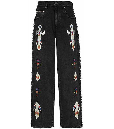 Damen Jeans aus Baumwoll-Denim Mittlere Leibhöhe Fransen 5-Pocket-Style Weites Bein Ethno-Stickereien Farbbezeichnung: Dark Grey Material: 100% Baumwolle ...