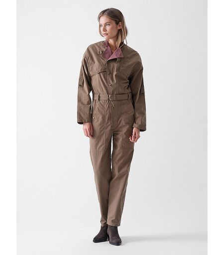 Zweifarbiger Damen Jumpsuit aus Crisp-Baumwolle Runder Kragen mit Lasche und Ringen Druckknopfverschluss Aufgesetzte Taschen mit Knopfklappen Lange Ärmel mit verstellbaren Laschen Gürtelschlaufen und abnehmbarer Gürtel mit Metallschnalle Aufgesetzte Seitentaschen Aufgesetzte Gesäßtaschen mit Druckknopfverschluss Metall-Details in Antik-Gold-Finish Lockerer Schnitt Farbbezeichnung: Khaki Material: 100% Baumwolle ...