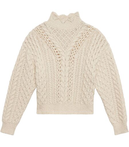 Damen Pullover aus Melange-Strick mit Zopfmuster Stehkragen mit festoniertem Abschluss Lange Ärmel Abschlüsse mit Rippbündchen Lockere Passform Farbbezeichnung: Ecru Material: 56% Baumwolle, 15% Polyamid, 13% Alpaka, 11% Acryl, 4% Wolle, 1% Elasthan ...