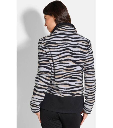 Freizeitjacke von CANYON im trendigen Zebralook. Die supersofte Fleece-Qualität trägt sich angenehm leicht und macht die Jacke zum idealen Begleiter für viele Freizeitaktivitäten. Blütenapplikationen mit silberfarbenen Nieten setzen verspielte Akzente, während breite unifarbene Saumabschlüsse dem Allovermuster Struktur verleihen. Ein hoher Stehkragen mit Durchzugband und weichem Innenbeleg, ein silberfarbener 2-Wege-Reißverschluss mit Zieranhänger sowie figurformende Teilungsnähte – teils dekorativ gearbeitet – runden den Look ab. Mit zwei Eingriffstaschen und geradem Saumabschluss. ...