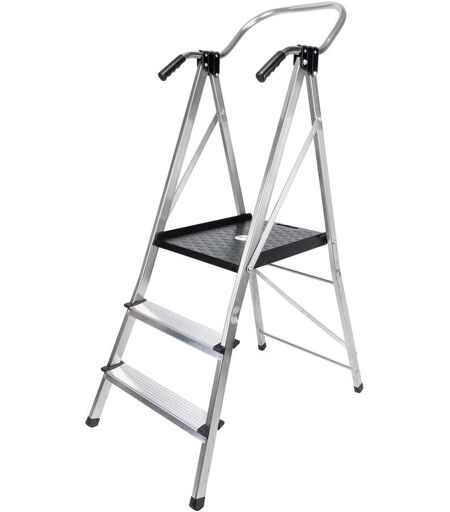 Sicherheit für drinnen und draußen! Die 3-stufige Sicherheitsleiter ist auf der höchsten Stufe mit einer großen, rutschfesten Plattform, einem Sicherheitsbügel und ergonomisch geformten Haltegriffen ausgestattet. Da kann nichts wackeln oder rutschen. Mit Klemmschutz in den Gelenken. Maße: zusammengeklappt nur 19 cm breit erste Tritthöhe: 22 cm Plattform: Höhe: 66 cm Maße (LxB): 50 x 39 cm ...