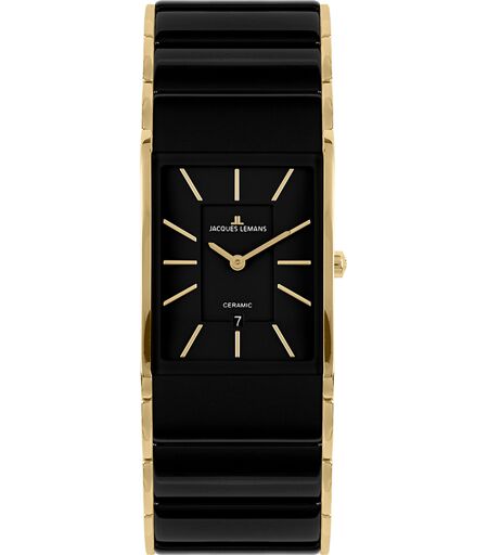 Gehäusematerial: massiv Edelstahl IP-gold Bandmaterial: Metall/High-Tech Ceramic Bandfarbe: schwarz Glasart: Saphirglas Zifferblattfarbe: schwarz Uhrwerk: Quarz Verschluss: Faltschließe Größe: 28x33 mm Wasserdichte: 5 bar ...