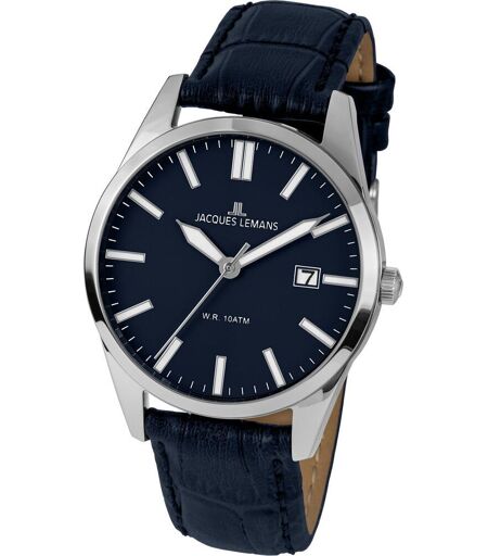 Gehäusematerial: Edelstahl Bandmaterial: Leder Bandfarbe: Dunkelblau Glasart: Crystexglas Zifferblattfarbe: Dunkelblau Uhrwerk: Quarz Verschluss: Dornschließe Wasserdichte: 10 Bar Gehäusedurchmesser: 40 mm ...