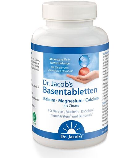 Nahrungsergänzungsmittel sind kein Ersatz für eine ausgewogene und abwechslungsreiche Ernährung und eine gesunde Lebensweise. Basen-Citrat-Mineralstoffe* in Natur-Balance – ideal für unterwegsMineralstoffe in Natur-Balance: reich an Kalium, arm an Natrium, Calcium/Magnesium-Verhältnis von 3:272 % Citrat-Mineralstoffe aus DeutschlandMit Vitamin C aus Acerola und Vitamin DFür Knochen und Zähne, Nerven und Muskeln, Immunsystem und normalen Blutdruck*Gut für Ihre Kollagenbildung, Haut, Haare, Nägel*Geeignet bei Diät, Basenkur, Basen-Fasten und basischer ErnährungVeganApotheken-Marke seit 1997 mit Fertigung in DeutschlandGezielter Basen-* und Mineralstoffausgleich***Die meisten Deutschen erreichen nicht die empfohlene Menge von fünf Portionen Obst und Gemüse täglich**. Dabei liefern diese die lebenswichtigen Mineralstoffe Kalium, Magnesium und Calcium.Dr. Jacob’s Basentabletten bieten eine praktische Lösung, um diese Mineralstoffdefizite gezielt auszugleichen*** und die typische Säurelast zu reduzieren. Eine Portion Dr. Jacob’s Basentabletten liefert 1200 mg Kalium, 375 mg Magnesium und 550 mg CalciumMit Zink unterstützen sie den normalen Säure-Basen-Stoffwechsel.**Rabenberg, Mensink (2011): RKI (Hrsg.): GBE kompakt 2; 6.***Nationale Verzehrsstudie 2 (MRI 2008).Citrat-Mineralstoffe, kaliumreich, natriumarm – nach dem Vorbild der NaturDr. Jacob’s Basentabletten enthalten 72 % Citrate (Salze der Zitronensäure) aus mineralischen und pflanzlichen Rohstoffen. Citrate kommen in Obst- und Gemüsesorten vor und sind auch ein natürlicher Bestandteil unserer Zellen. Der Körper nimmt diese organischen Mineralstoffverbindungen sehr gut auf und verstoffwechselt sie effizient.Dr. Jacob’s Basentabletten liefern Calcium und Magnesium im natürlichen Verhältnis von 3:2, reichlich Kalium und nur wenig Natrium – ganz nach dem Vorbild der Natur, wie Mineralstoffe in Obst, Gemüse und unseren Körperzellen vorkommen.Kalium, Magnesium und Calcium – ein ideales Trio für Ihre Nerven*Wenn der Alltag zunehmend anspruchsvoller wird, ist es umso wichtiger, auf sich selbst zu achten. Stress fördert eine unausgewogene Ernährung, Erschöpfung und Verspannungen. Oft greifen wir dann lieber zu Chips und Cola statt mineralstoffreichem Gemüse.Kalium, Magnesium und Calcium bilden jedoch ein ideales Trio für Nerven und Muskeln*: Kalium und Magnesium unterstützen die normale Funktion des Nervensystems, während Calcium zur normalen Signalübertragung zwischen den Nervenzellen beiträgt. Calcium unterstützt die normale Muskelkontraktion, während Magnesium die Muskelentspannung fördert und Erschöpfung reduziert.*Damit Sie den Alltag entspannter und agiler meistern können!*Kalium – der führende Mineralstoff in Obst, Gemüse und KörperzellenKalium ist der bedeutendste basenbildende Mineralstoff sowohl in der Ernährung als auch in jeder Zelle unseres Körpers. Es trägt zur normalen Funktion von Nerven und Muskeln sowie zur Aufrechterhaltung eines normalen Blutdrucks bei. In Deutschland wird jedoch zu... ...