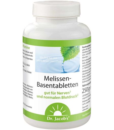 Anwendungsgebiet von Dr. Jacob's Melissen-Basentabletten B-Vitamine MineralstoffeDr. Jacob's Melissen-Basentabletten B-Vitamine Mineralstoffe ist ein Nahrungsergänzungsmittel mit Magnesium, Zink und Kalium.