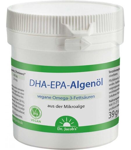 *Die in DHA-EPA-Algenöl enthaltenen Nährstoffe tragen zu folgenden normalen Körperfunktionen bei: • Erhaltung der Sehkraft – DHA (bei 250 mg täglich)• Erhaltung der Gehirnfunktion – DHA (bei 250 mg täglich)• Herzfunktion – DHA und EPA (bei insgesamt 250 mg täglich)Wirkstoffe / Inhaltsstoffe / ZutatenDr. Jacob's DHA-EPA-Algenöl Kapseln Omega-3-Fettsäuren vegan enthält: