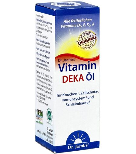 Anwendungsgebiet von Dr. Jacob's DEKA Öl 800 IE Vitamin D3+K2+A+E 640 TropfenDr. Jacob's DEKA Öl 800 IE Vitamin D3+K2+A+E 640 Tropfen enthält alle vier fettlöslichen Vitamine in nur einem Tropfen und ist ideal für alle, die noch mehr für ihr Immunsystem tun wollen. Pro Portion (1 Tropfen) sind 20 µg (800 I.E.) Vitamin D3, 12 mg Tocopherole (4 mg Vitamin E), 20 µg Vitamin K2 und 240 µg Retinol-Äquivalente (Vitamin A) enthalten.
