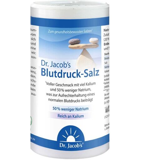 Anwendungsgebiet von Dr. Jacob's Blutdruck-Salz mit Kalium SalzersatzErnährungswissenschaftler empfehlen, auch in Bezug auf unseren Blutdruck, eine kaliumreiche, natriumarme Ernährung. Die Natriumreduktion und die Aufnahme von Kalium tragen zur Aufrechterhaltung eines normalen Blutdrucks bei.