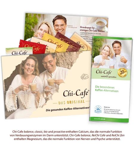 Chi-Cafe balance 10 g (2 Tassen), Chi-Cafe classic 12 g (2 Tassen), Chi-Cafe bio 12 g (2Tassen), Rei Chi Cafe 10 g (2 Tassen), Chi-Cafe proactive 10 g (2 Tassen), Chi-Cafe free 10 g (2 Tassen), Chi-Cafe Flyer, Rezeptkarte.