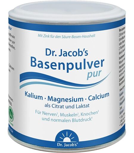 Anwendungsgebiet von Dr.Jacob's Basenpulver pur Basen-Citrat-Laktat+MineralstoffeDr.Jacob's Basenpulver pur Basen-Citrat-Laktat+Mineralstoffe ist ein Nahrungsergänzungsmittel mit Mineralstoffen wie Calcium, Magnesium, Kalium und Zink. Diese Mineralstoffe sind auf Basis von Citrat und Laktat enthalten, Laktat ist das Salz der Milchsäure. Es stammt aus einer natürlichen, milchfreien Fermentation, bei der rechtsdrehende Milchsäure entsteht. Dr.Jacob's Basenpulver pur Basen-Citrat-Laktat+Mineralstoffe enthält kein Natrium und ist reich an Kalium. Kalium ist der wichtigste Basenbildner in Obst und Gemüse, aber auch in unseren Körperzellen. Calcium und Magnesium sind wie in Obst und Gemüse im Verhältnis 3:2 vorhanden.