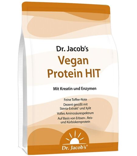 Anwendungsgebiet von Dr. Jacob's Vegan Protein HIT Proteinpulver+Kreatin+EnzymeDr. Jacob's Vegan Protein HIT Proteinpulver+Kreatin+Enzyme ist ein Nahrungsergänzungsmittel und enthält eine vegane Proteinmischung aus Erbsen-, Reis- und Kürbiskern-Protein, die ein vollständiges Aminosäurespektrum mit Kreatin und einem Enzymkomplex aus Amylase, Protease, Lipase, Laktase und Cellulase bietet.