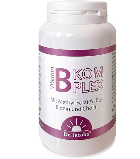 Anwendungsgebiet von Dr Jacob's Vitamin-B-Komplex KapselnBioaktive B-Vitamine für optimale Wirkung*Dr Jacob's Vitamin-B-Komplex Kapseln enthalten alle essenziellen B-Vitamine in einer einzigen Kapsel:Vitamin B1, B2, B6, B12, Niacin (B3), Pantothensäure (B5), Biotin (B7), und Folsäure (B9). Die B Vitamine arbeiten synergetisch zusammen – nur in ausreichender Menge können sie lebenswichtige Prozesse optimal unterstützen.Einige B-Vitamine müssen vom Körper erst in ihre aktive Form umgewandelt werden. Folsäure und Vitamin B12 werden hierfür beispielsweise methyliert. Funktioniert der Methylierungsprozess nicht optimal, kann auch eine ausreichende Folsäure- und B12-Zufuhr nicht den gewünschten Effekt erzielen.Dr Jacob's Vitamin-B-Komplex Kapseln enthalten daher bereits bioaktive Formen:Folsäure als 5-MTHFVitamin B12 als MethylcobalaminVitamin B6 als Pyridoxal-5-PhosphatDiese Formen sind direkt verfügbar und unterstützen den Stoffwechsel so besonders effizient.*B-Vitamine für Ihre Gesundheit**Die in Dr Jacob's Vitamin-B-Komplex Kapseln enthaltenen Vitamine tragen nachweislich zu folgenden normalen Körperfunktionen bei:Energiestoffwechsel und Verringerung von Müdigkeit – Vitamine B2, Niacin, Pantothensäure, B6, B12Geistige Leistung – PantothensäurePsychische Funktion und Nervensystem – Vitamine B1, Niacin, B6, Biotin, B12Homocystein-Stoffwechsel – Cholin, Folsäure, Vitamine B6 und B12Fettstoffwechsel – CholinErhaltung der Leberfunktion – CholinHerzfunktion – Vitamin B1Bildung roter Blutkörperchen – Vitamin B6, B12Immunsystem – Folsäure, Vitamine B6 und B12Schutz der Zellen vor oxidativem Stress – Vitamin B2Erhaltung von Haut und Schleimhäuten – Vitamin B2, Niacin, BiotinErhaltung von Haut und Haaren – BiotinNährstoff-Power für Nerven und Gehirn*Das Nervensystem hat einen besonders hohen Nährstoffbedarf. Unser Gehirn benötigt kontinuierlich Energie und essenzielle Vitamine, um optimal zu funktionieren ...