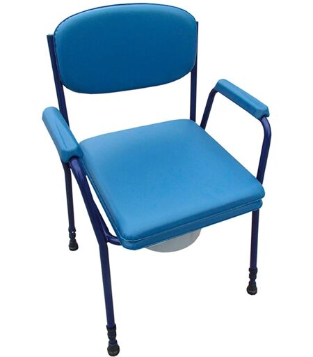 Stabiler Toilettenstuhl mit korrosionsbeständigem Rahmen aus Aluminium. Gepolsterte Flächen mit pflegeleichtem PVC-Bezug. Höhenverstellbar. Maße: Sitzfläche (LxB): 45 x 41 cm Sitzhöhe: 51 - 56 cm Sitzflächenöffnung (LxB): 23 x 27 cm ...
