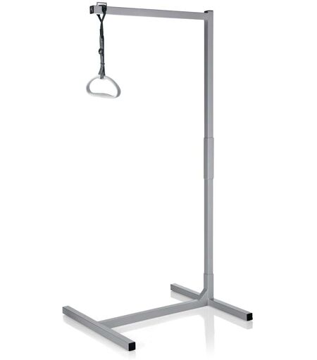 Mit dieser Aufrichthilfe können Sie sich auch im Krankheits- oder Pflegefall sicher im eigenen Bett aufrichten. Sie unterstützt beim Aufrichten aus einer liegenden in eine sitzende Position, hilft aber ebenso beim Anheben des Gesäßes, um eine Bettpfanne zu verwenden. Auch kann der 176 cm hohe Bettgalgen als Sicherungshilfe beim Umsetzen vom Bett in einen Roll- oder Toilettenstuhl dienen. Die Griffhöhe lässt sich an dem Gurt einstellen (1,24 bis 1,33 m vom Boden aus) und damit an die eigene Körpergröße anpassen. Die Aufrichthilfe besteht aus drei Teilen aus stabilem Stahl, die sich einfach zusammenstecken lassen, sodass Sie sie nach Bedarf flexibel einsetzen können. Einzige Voraussetzung: Der Bettgalgen (Standfläche: ca. 83 x 76 cm) braucht eine ebene Stellfläche für einen stabilen Stand. Eine Montage ist nicht erforderlich. Bei Nichtgebrauch lässt sich die Aufstehhilfe wieder in ihre drei Teile zerlegen und platzsparend verstauen. ...