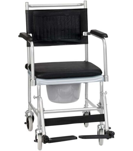 Rollstuhl und Toilettenstuhl in Einem. Bequem fahrbar auf 4 Lenkrollen, die beiden hinteren mit Feststellbremse. Abnehmbares Sitzpolster, Sitzbrille, Öffnung 26 x 23 cm. Entnehmbarer 5 Liter-Eimer mit Deckel und Bügel. Aus pulverbeschichtetem Stahlrohr, Eimer, Sitzbrille und Fußstützen aus Kunststoff, Armlehnen aus Polyurethan. Belastbar bis 120 kg. Einfache Montage ohne Werkzeug. Geprüftes Medizinprodukt. ...