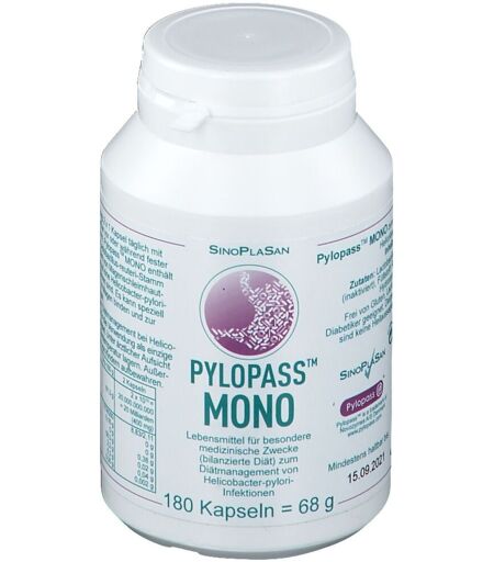 Bitte achten Sie auf eine abwechslungsreiche und ausgewogene Ernährung und gesunde Lebensweise.Pylopass Mono 200Zur diätetischen Behandlung von Helicobacter-pylori-Infektionen.Polypass Mono enthält einen inaktiven Lactobazillus-reuteri-Stamm zur diätetischen Behandlung von Magenschleimhaut-Entzündungen.Es kann speziell Helicobacter pylori im Magen binden und zur Ausscheidung bringen.Zutaten:Lactobacillus reuteri DSM17648 (inaktiviert), Füllstoff: Reismehl, Kapselhülle Hydroxypropylmethylcellulose.Frei von Gluten, Lactose und Fructose. Nährwerte pro 100 g 2 Kapseln % NRV* Pylopass Lactobacillus reuteri DSM17648 (inaktiviert) 61,3 g 2x10^10 20.000.000.00 = 20 Mrd. (400 mg) - Brennwert 1174 kJ / 280 kcal 8,83 kJ / 2,11 kcal - Fett 0,16 g 0 g - davon ges. Fettsäuren 0 g 0 g - Kohlenhydrate 50,3 g 0,8 g 0,15 % davon Zucker 2,2 g 0,02 g 0,02 % Eiweiß 5,3 g 0,04 g 0,08 % Salz 35,2 g 0,26 g 4,33 % *% NRV = Prozentanteil der empfohlenen Tagesdosis.Verzehrempfehlung:1 - 2 x 1 Kapsel täglich mit viel Flüssigkeit auf nüchternen Magen verzehren.Hinweis:Die angegebene empfohlene Tagesmenge darf nicht überschritten werden.Aufbewahrung: Kühl (6-25 °C) und lichtgeschützt lagern. Außerhalb der Reichweite von Kindern aufbewahren.Nettofüllmenge: 180 Kapseln = 68 gHerstellerdaten: SinoPlaSan AG Krapfenreuter Str. 4 D-73066 Uhingen ...