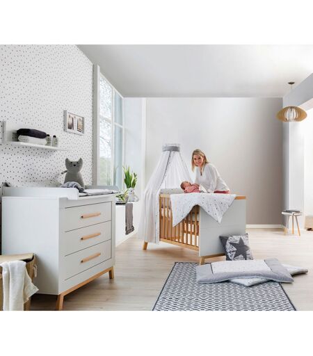 Angesagter Scandi Look, langlebiges Design – mit dem zweiteiligen Babyzimmer Miami machst Du alles richtig. Babybett Miami Lieferumfang: Babybett Schardt Miami, 3 Schlupfsprossen, 3-fach höhenverstellbarer Lattenrost, Umbauseiten Material: Buche massiv und Melamin Verwendung: Kombi-Kinderbett, umbaubar zum Juniorbett Belastbarkeit: Babybett bis 15 kg, Juniorbett bis 30 kg Maße: 144(L) x 77(B) x 86(H) cm; Liegefläche 140(L) x 70(B) cm Mit seinem stabilen Sprossengitter sorgt das Babybett für die Sicherheit Deines Kleinen. Besonders praktisch: Für einfaches Hineinlegen und Herausnehme ist der Lattenrost dreifach höhenverstellbar. Wird Dein Kind selbstständiger, kann durch Ausbauen der Schlupfstäbe ein praktischer Einstieg geschaffen werden. Unabhängig von elterlicher Hilfe gelangt der Nachwuchs jetzt in sein Bett – ganz ohne gefährliche Klettereien. Mithilfe der mitgelieferten Umbauseiten wird das Babybett schließlich zum Juniorbett. Wickelkommode Miami Material: Buche massiv und Melamin Innenausstattung: 3 Schübe besondere Funktionen: Schübe mit Selbsteinzug, extrastarke seitliche Führungsschienen, Wickelaufsatz abnehmbar Maße: 93/101(H) x 109(B) x 53/72(T) cm, Wickelhöhe: 93 cm Die Miami Wickelkommode bietet eine angenehme Wickelhöhe von 93 Zentimetern. Für Sicherheit beim Wickeln sorgt der mitgelieferte Wickelaufsatz, der mit erhöhten Seiten versehen ist. So kann Dein Baby nicht herunterrollen. Drei Schubladen bieten viel Stauraum für Wickelutensilien und Co. Praktisch: Der Selbsteinzug sorgt dafür, dass die Schubladen sanft und leise schließen. Extrastarke seitliche Führungsschienen machen die Schubladen besonders belastbar. Langlebig: Der Wickelaufsatz ist abnehmbar. So wird aus der Wickelkommode eine praktische Kommode, die Deinen Nachwuchs lange Zeit begleitet. Hinweise Die Lieferung erfolgt zerlegt, mit Aufbauanleitung, ohne Dekoration. ACHTUNG: Bitte bei der Bestellung eine Telefonnummer angeben, da dieser Artikel mit der Spedition geliefert wird! ...
