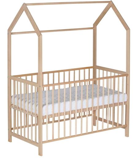 Das Hausbett Micky von Schardt ist als Beistellbett, Gittervariante und Sofa im Einsatz. So bietet es dem Kind über einen langen Zeitraum einen gemütlichen Platz. Lieferumfang: Hausbett Micky von Schardt, höhenverstellbarer Lattenrost, 3 Schlupfsprossen, inkl. Umbauseite und Gurtsystem Material: Buche (massiv, lackiert) Verwendung: Beistellbett, Babybett (0 bis 3 Jahre), Sofa Belastbarkeit: bis 15 kg Maße: 124(L) x 65(B) x 160(H) cm, Liegefläche 120(L) x 60(B) cm, Lattenrost 19 bis 45 cm Das Hausbett Micky von Schardt setzt auf ein originelles Design. Das spitz zulaufende Dach dient als Basis für Stoffbahnen und Tücher, die für eine gemütliche Atmosphäre sorgen. Auch als Befestigungsmöglichkeit für ein Mobile überzeugt das Extra. Ist das Design als Beistellbett im Einsatz, kann es über das Gurtsystem direkt mit dem Elternbett verbunden werden. Die 120 mal 60 Zentimeter große Liegefläche ist stufenlos höhenverstellbar. Ist das Bett als Gittervariante im Einsatz, überzeugen drei Schlupfsprossen als praktisches Detail. Sie ermöglichen dem Nachwuchs einen selbstständigen Zugang zum Bett. In Kombination mit der Umbauseite ist das aus massiver Buche in Deutschland gefertigte Bett auch als Sofa im Einsatz. ...