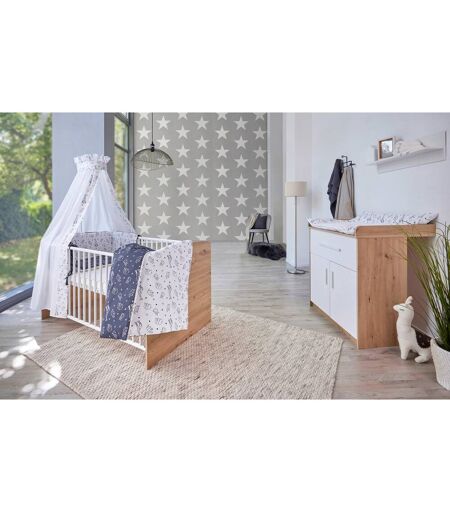 Das zweiteilige, in Deutschland gefertigte Möbel-Set Pepe von Schardt besteht aus dem Kombi-Kinderbett und der Wickelkommode der Serie. Die Möbel punkten im skandinavischen Stil mit Partien in Eichen-Optik und weißen Elementen sowie einer großen Portion Flexibilität. Babybett Pepe Lieferumfang: Kombi-Kinderbett Pepe, 3-fach höhenverstellbarer Lattenrost, 3 Schlupfsprossen, Umbau-Kit Material: Kopf- und Fußteil Melamin-Dekor Pepe, Rundholmgitter Buche (weiß, lackiert) Verwendung: Babybett (0 bis 3 Jahre), umbaubar zum Juniorbett (3 bis 6 Jahre) Belastbarkeit: Babybett bis 15 kg, Juniorbett bis 30 kg Maße: 143(L) x 77(B) x 79,5(H) cm Das Kombi-Kinderbett Pepe lädt den Nachwuchs vom ersten Lebenstag bis ins Schulalter zum Entspannen und Träumen ein. Die Minis können die Sicherheit genießen, die ihnen die weiß lackierten Rundholmgitter bieten. Werden die Kleinen älter, überzeugen die herausnehmbaren Schlupfsprossen als clevere Details. Sie erlauben es den Kids, selbstständig ins Bett hinein- und wieder herauszuklettern. Auch der Lattenrost passt sich an den Entwicklungsstand des Kindes an. Er ist dreifach höhenverstellbar. So gestaltet sich das Ablegen und Herausheben des Kindes so komfortabel wie möglich. Da ein Umbau-Kit zum Lieferumfang gehört, kann das Babybett im Nu eine Junior-Variante verwandelt werden. Die Belastbarkeit des Designs erhöht sich in diesem Fall um 15 auf 30 Kilogramm. Wickelkommode Pepe Material: Korpus Dekor Pepe, Fronten Dekor weiß Ausstattung: Schublade, 2 Türen mit Einlegeboden, abnehmbarer Wickelaufsatz Funktionen: Schublade mit Selbsteinzug und extra starken Führungsschienen Maße: 98(H) x 79(B) x 43/68(T) cm, Wickelhöhe 86 cm Die Wickelkommode Pepe gestaltet die Babypflege komfortabel. Sämtliche Produkte, die benötigt werden, finden bequem in dem Möbelstück Platz. Zur Auswahl stehen eine mit extra starken Führungsschienen und Selbsteinzug versehene Schublade und zwei hinter den Türen platzierte Fächer. Der in einer Höhe von 86 Zentimetern angebrachte Wickelaufsatz ist an drei Seiten umrandet. Wird er abgenommen, wird aus der Wickelkommode ein klassisches Sideboard. Hinweise Die Lieferung erfolgt ohne Dekoration. Das abgebildete Wandregal ist nicht im Lieferumfang enthalten. Es kann separat bestellt werden. Bitte bei der Bestellung eine Telefonnummer angeben, da dieser Artikel mit der Spedition geliefert wird! ...