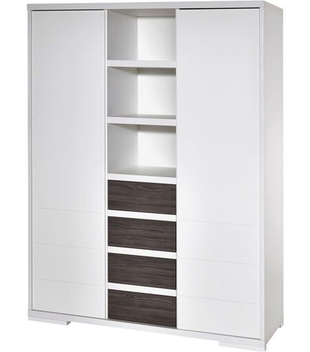 Der zweitürige Kleiderschrank Maxx Fleetwood von Schardt bietet Platz für die gesamte Kinderausstattung. Durch das offene Mittelregal erlaubt er schnellen Zugriff auf häufig benötigte Kleidungsstücke und ist zugleich ein stilvoller Blickfang. Material: MDF, weiß lackiert, Holzdekor Fleetwood Innenausstattung: 2 Türen, 2 Kleiderstangen, 4 Böden, 4 Schubladen, Mittelregal mit 3 Fächern besondere Funktionen: Türen mit Soft-Close-System, Schubladen mit Push-to-Open-Funktion, stabile seitliche Führungsschienen Maße: 187,8(H) x 139(B) x 53(T) cm Der Schrank stellt zwei Kleiderstangen, diverse Fächer und vier Schubladen zur Verfügung. So finden in ihm nicht nur Kleidung, sondern auch Spielzeug und Co seinen Platz. Die Türen schließen durch das Soft-Close-System besonders leise. Die Schubladen werden durch ein kurzes Entgegendrücken geöffnet. Beim Design wird hier auf die Kombination von lackierten und im Holzdekor gestalteten Fronten gesetzt. Hinweis Bitte bei der Bestellung eine Telefonnummer angeben - die Lieferung erfolgt per Spedition. ...