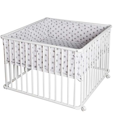 Das Laufgitter Basic von Schardt bietet dem Baby viel Platz zum Strampeln, Schlafen und Herumrollen. Massive Rundholmgitter aus hochwertigem Buchenholz sorgen für höchste Stabilität und Sicherheit. Laufgitter inkl. Einlegeboden und Laufgittereinlage Rundholme aus massivem Buchenholz 2-fach höhenverstellbarer Boden 100 x 100 cm belastbar bis 15 kg Die Konstruktion aus massivem Buchenholz macht das Laufgitter besonders stabil. Die Ecken sind aus robustem Kunststoff und durch die Easy-Click Druckverschlüsse fällt der Zusammenbau und das Zerlegen leicht. Mit dem zweifach höhenverstellbaren Einlegeboden lässt sich das Laufgitter optimal anpassen. Auf der hohen Einstellung kann das Baby leicht hineingesetzt und herausgehoben werden, wird das Kind größer, ist es auf der niedrigeren Stufe sicher und kann sich am Gitter aufstellen. In Verbindung mit der Laufgittereinlage bildet der gepolsterte Boden eine gemütliche Liege- und Lauffläche für das Baby. Die Oberfläche der Einlage besteht aus Baumwolle. Sie ist mit Polyesterflies gefüllt und bei 30 °C im Schonwaschgang waschbar. Die Einlage wird mit den praktischen Schlaufen an den Holmen des Gitters fixiert. Mit seinen vier feststellbaren Rollen lässt sich das Gitter auf Teppich-, Parkett- oder Fliesenböden problemlos verschieben. Durch die leichte Zerlegbarkeit und die kompakten Abmessungen eignet sich das Laufgitter auch hervorragend für die Mitnahme in den Urlaub oder in den Wochenendausflug. ...