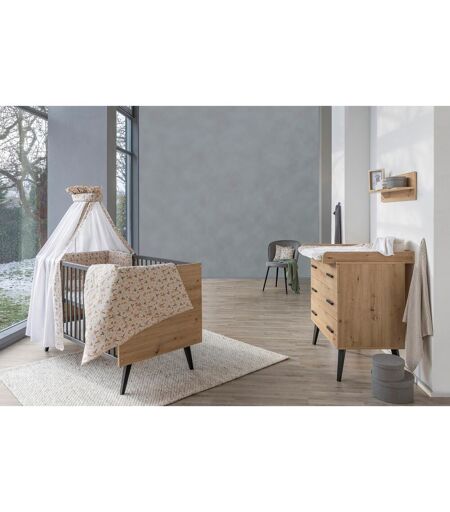 Das zweiteilige Babyzimmer enthält das Babybett und die Wickelkommode der Morris Oak-Linie von Schardt. Das Set überzeugt mit einem coolen Design, Langlebigkeit und praktischen Funktionen. Babybett Morris Oak Lieferumfang: Babybett Morris Oak von Schardt, 3-fach höhenverstellbarer Lattenrost, 3 Schlupfsprossen, Umbauseiten Material: Kopf- und Fußteil Holzdekor Artisan Oak, Kantholmgitter und Füße Buche (massiv, anthrazit lackiert), Made in Germany Verwendung: Babybett (0-3 Jahre), umbaubar zum Juniorbett (3-6 Jahre) Belastbarkeit: Babybett bis 15 kg, Juniorbett bis 30 kg Maße: 144(L) x 77(B) x 86(H) cm, Liegefläche 140(L) x 70(B) cm Das Design des Babybetts mit Holzdekor und anthrazit lackierten Holmen und Füßen passt ideal zur Wickelkommode der Morris-Oak-Linie. Es lässt sich ab der Geburt Deines Minis nutzen. Der Lattenrost kann dreifach in der Höhe verstellt werden: Das Hineinlegen und Herausheben des Kindes ist so rückenschonend möglich. Ist Dein Mini selbstständiger, kannst Du die drei Schlupfsprossen entfernen. So krabbelt Dein Kind ganz alleine ins Bett und wieder heraus. Aus massiver Buche gefertigt, bietet das Bett eine gute Stabilität. Extra Langlebigkeit: Die Umbauseiten machen aus dem Baby- im Nu ein Kinderbett. Seine markanten Kontraste zeichnen das skandinavische Design aus. Wickelkommode Morris Oak Material: Korpus und Fronten Holzdekor Artisan Oak, Füße Buche Massivholz anthrazit lackiert, Made in Germany Ausstattung: 3 Schubladen mit extra starken seitlichen Führungsschienen, abnehmbarer Wickelaufsatz Funktionen: Self-Soft-Close-System Maße: 90(B) x 53/72(T) x 102(H) cm, Wickelhöhe 94 cm Die Wickelkommode Morris Oak von Schardt verfügt über eine große Ablagefläche. Die Begrenzungen sorgen für Sicherheit. Die drei Schubladen bieten allen Wickel-Utensilien Platz und sind mit einem praktischen Self-Soft-Close-System ausgestattet. Sobald Dein Mini nicht mehr gewickelt werden muss, kannst du die Auflage einfach abnehmen. Nun dient die Kommode als vielseitiges Sideboard. ...