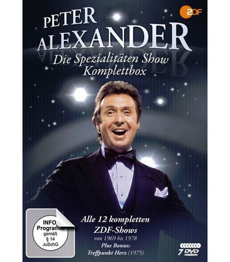 "Peter Alexander präsentiert jährlich in einer großen Fernseh-Galashow viele seiner Lieder und Sketche. Mit großartigen Gästen wie Mireille Mathieu, Caterina Valente, Max Schmeling, Tony Marshall, Cornelia Froboess, Peggy March, Rex Gildo, Erik Ode, Luis Trenker, Freddy Quinn, Liselotte Pulver, Karel Gott, Rudi Carrell, Heintje Simons, Roy Black, Gunther Philipp, Marika Rökk, Anneliese Rothenberger. Legendär ist auch der Schluss jeder Show mit dem wunderbaren Evergreen ""Danke schön, es war bezaubernd"". Peter Alexander präsentiert Spezialitäten (ZDF, 1969 - 1978) Alle 12 Ausgaben in einer DVD-Komplettbox plus Bons „Treffpunkt Herz“: 09.03.1969: Peter Alexander präsentiert Spezialitäten 05.07.1969: Peter Alexander präsentiert Spezialitäten 07.12.1969: Peter Alexander präsentiert Spezialitäten 06.12.1970: Peter Alexander präsentiert Spezialitäten 14.02.1971: Peter Alexander präsentiert Spezialitäten 28.11.1971: Peter Alexander präsentiert Spezialitäten 03.12.1972: Peter Alexander präsentiert Spezialitäten 04.04.1974: Peter Alexander präsentiert Spezialitäten 28.11.1974: Peter Alexander präsentiert Spezialitäten 27.11.1975: Peter Alexander präsentiert Spezialitäten 01.12.1977: Peter Alexander präsentiert Spezialitäten 30.11.1978: Peter Alexander präsentiert Spezialitäten f Bonusmaterial: 04.10.1975: Treffpunkt Herz, die ZDF-Gala der deutschen Krebshilfe" ...