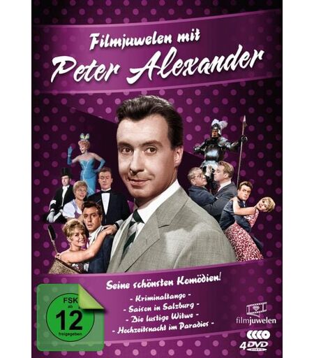 "Produktionsjahre: 1960-1962 Vier der erfolgreichsten Komödien mit Peter Alexander in einer schönen Sammlerbox! ""Kriminaltango"": Peter Alexander in einer Paraderolle: Erst singt er seinen Gästen im eigenen Haus etwas vor, dann schmeißt er alle raus, da er blank ist. Das Haus soll verkauft werden und Peter möchte aufs Land zu seiner Tante ziehen. Als er bereits bei ihr ist, lassen sich drei Gauner in seinem Haus nieder. Das führt zu heitersten Turbulenzen mit viel Spaß, Verwechslungen und der Darbietung des berühmten Schlagers ""Kriminaltango"". ""Saison in Salzburg - Wenn der Toni mit der Vroni"": Drei arbeitslose Schauspieler verdingen sich in einem Alpengasthof als Aushilfen. Dabei spielen sie ihre ehemaligen Bühnenrollen (Kellner, Liftboy, Portier) so überzeugend, dass sie fest eingestellt werden. Verfilmung der gleichnamigen Erfolgs-Operette mit Peter Alexander, der hier einige seiner bekanntesten Lieder singt: ""Salzburger Nockerln"", ""Und die Musik spielt dazu"", ""Wenn der Toni mit der Vroni"". ""Die lustige Witwe"": Franz Lehárs Operette präsentiert Peter Alexander in einer Komödie mit viel Musik! Lebemann Danilo genießt Paris in vollen Zügen. Doch er soll sich in der Stadt an der Seine auf die Geschäfte der Firma seines Onkels konzentrieren. Als er das nicht tut, überlegt sich Onkel André eine List. In diese ist auch Hanna eingebunden, die zur „lustigen Witwe“ von André wird… ""Hochzeitsnacht im Paradies"": Heinz Hentschkes Operette präsentiert Peter Alexander in einer Komödie mit viel Musik! Die eifersüchtige Revuesängerin Ilonka Davarosch ist auf Schritt und Tritt hinter ihrem Gesangskollegen Dr. Ulrich Hansen her ... Mit musikalischen Evergreens wie ""Es kommt auf die Sekunde an"", ""Alle Wege führen mich zu dir"" und ""So stell ich mir die Liebe vor""." ...