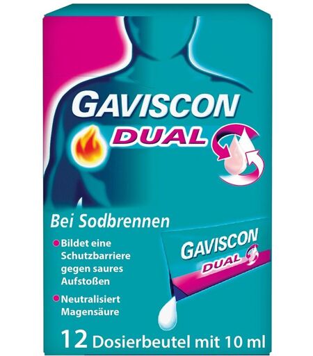 Anwendungsgebiet von GAVISCON Dual Suspension mit Zweifachwirkung gegen SodbrennenGAVISCON Dual Suspension mit Zweifachwirkung gegen Sodbrennen ist eine Kombination aus zwei Antazida (Calciumcarbonat und Natriumhydrogencarbonat) und einem Alginat und wirkt in zweifacher Weise. Das Arzneimittel wird angewendet zur Behandlung der säurebedingten Symptome des gastroösophagealen Reflux wie saures Aufstoßen, Sodbrennen, Verdauungsstörungen z. B. nach den Mahlzeiten oder während der Schwangerschaft.Wirkungsweise von GAVISCON Dual Suspension mit Zweifachwirkung gegen SodbrennenIm Gegensatz zu einigen vergleichbaren Medikamenten gegen Sodbrennen wirkt GAVISCON Dual Suspension mit Zweifachwirkung gegen Sodbrennen zweifach: Der Inhaltsstoff Alginat legt sich wie ein Schutzfilm auf den Mageninhalt und verhindert so das Aufsteigen des sauren Speisebreis in die empfindliche Speiseröhre. Gleichzeitig wird die Magensäure neutralisiert. So können Schmerzen und andere unangenehme Beschwerden wie Magendruck, saures Aufstoßen und Völlegefühl für bis zu vier Stunden gelindert werden.
