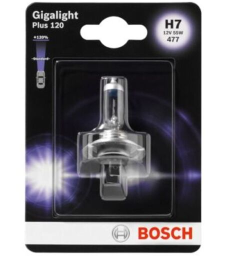 Art der Glühlampe: H7. Hersteller: BOSCH. Herstellernummer: 1 987 301 110. Index: 1 987 301 110. Lampentyp: Halogen. Linie: Gigalight Plus 120%. Nennleistung [W]: 55. Spannung [V]: 12. Steckdosentyp: PX26D. Stückzahl : 1. Verpackung: Blister. ...