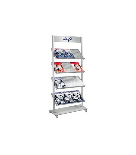 Für einen guten ersten Eindruck – das Kerkmann Prospektregal Rico silber DIN A4Ob in den Geschäftsräumen, im Eingangsbereich oder in der Praxis – Ihre Prospekte sollten immer ansprechend und auffällig für Ihre Kunden dargestellt werden, daher sind Sie mit dem Kerkmann Prospektregal Rico silber DIN A4 bestens beraten. Es hat alle Ihre Prospekte und Informationen für Ihre Kunden auf einen Blick parat und sieht darüber hinaus noch schön aus.Ausgestattet mit 12 FächernEingesetzt werden kann das Kerkmann Prospektregal Rico im Innenbereich und somit eignet es sich hervorragend dafür, wichtige Informationen in Büros zu präsentieren. Ihnen stehen 12 Fächer auf 4 Ebenen für Ihre Broschüren und Infomaterialien zur Verfügung. Geeignet ist das Modell für alle Informationen, Ausdrucke und Informationen im DIN A4-Format. Insgesamt liegen die Maße bei 78,5 x 30,0 x 165,0 cm BxTxH).Das Material entscheidet über das AussehenDas Gestell ist aus Stahl gefertigt und damit nicht nur robust, sondern auch pflegeleicht. Außerdem bieten die stabilen Fächer aus Lochstahl genug Stauraum und bringen Ihre Kundeninformationen perfekt zur Geltung.Sie haben ein passendes Modell gefunden?Damit Sie sofort beginnen können, erhalten Sie die Lieferung des Kerkmann Prospektregals Rico silber DIN A4inklusive Aufkleber "info", Montagematerial. ...