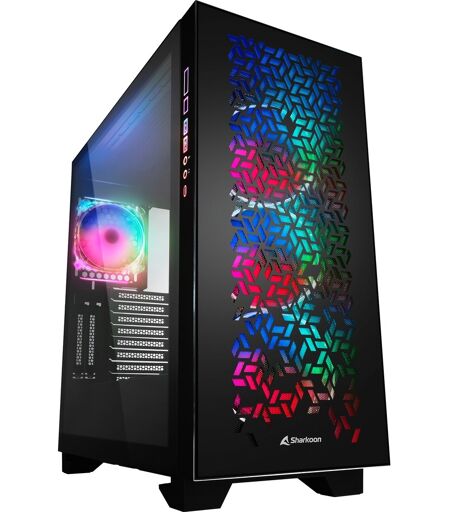 Der ELITE SHARK CA300H ist mit seinem eindrucksvollen Design, dem ausgeklügelten Layout und einer Front, die ins Auge sticht, ein echter Blickfang in jedem Spiel- oder Arbeitszimmer. Die aus gehärtetem Glas gefertigten Seitenteile gewähren einen Blick auf das aufgeräumte Innenleben. Die seitlich angebrachte RGB-beleuchtete I/O-Blende reiht sich in die gelungene LED-Optik ein und dank der parallelogramm-förmigen Öffnungen der stählernen Frontblende kommt zudem die farbenfrohe Optik der RGB-LED-Lüfter voll zur Geltung. Die ausdrucksstarke Front des CA300H sticht mit seinem auffälligen geometrischen Design und den drei dahinter verborgenen RGB-LED-Lüftern sofort ins Auge. Die Seitenteile aus gehärtetem Glas geben den Blick frei auf das aufgeräumte Innenleben, das durch den im hinteren Teil des Gehäuses sitzenden, vierten RGB-LED-Lüfter zusätzlich ausgeleuchtet wird. Um einzigartige Lichteffekte zu generieren, lassen sich die LEDs sämtlicher verbauter Lüfter über die Software kompatibler Mainboards mit einer Pinbelegung von 5V-D-Coded-G oder 5V-D-G gezielt ansteuern. Hochwertige Materialien wie die aus solidem Metall gefertigte, perforierte Oberseite tragen zusätzlich zur edlen Optik des Gehäuses bei. Ein besonderes Detail des CA300H findet sich an der ohnehin schon imposanten Front wieder. Statt die I/O-Blende, wie meist üblich, an der Oberseite anzubringen, ist sie seitlich platziert. Knöpfe und Anschlüsse sind somit besonders gut zu erreichen, wenn der PC auf dem Tisch stehend präsentiert wird. Neben den gängigen Anschlüssen für Audio und USB hat Sharkoon dem CA300H zudem einen USB-C-Anschluss spendiert. Den letzten Schliff erhält die I/O-Blende durch eine eigene RGB-Beleuchtung. Drei vorinstallierte RGB-LED-Lüfter in der Front und einer an der Rückseite versorgen das CA300H mit einem konstanten Airflow. Damit ausreichend Luft ins Gehäuse fließen kann, ist die Frontblende mit einem Mesh-Gitter versehen. Die Gehäuseoberseite bietet für Lüfter und Radiatoren sogar eine komplette Öffnung mit perforierter Abdeckung. Die drei 120-mm-RGB-LED-Lüfter in der Front können auch durch größere Exemplare mit einem Durchmesser von 140 Millimetern ausgetauscht werden. Zudem lassen sich bis zu 420-mm-Radiatoren in der Front oder bis zu 360-mm-Radiatoren in der Oberseite des Gehäuses einbauen. Hardware, die in einem Gehäuse der ELITE SHARK Serie einziehen darf, verdient es auch gesehen zu werden. Für den vollen Durchblick ist das CA300H mit gleich zwei Seitenteilen aus gehärtetem Glas ausgestattet. Auf der linken Seite bietet sich damit ein ungetrübter Einblick ins Innere des Gehäuses, um so die verbauten Komponenten perfekt zur Schau stellen zu können. Rechts hingegen ist das Glas teilweise schwarz getönt, damit etwa der Netzteil-Tunnel nicht die Optik stört. SSDs mit RGB-Elementen oder imposante HDDs kommen hier jedoch voll zur Geltung. Kabelgewirr hat hingegen keine Chance: es kann einfach hinter einem geräumigen, aufklappbaren Kabelfach sowie einer... ...