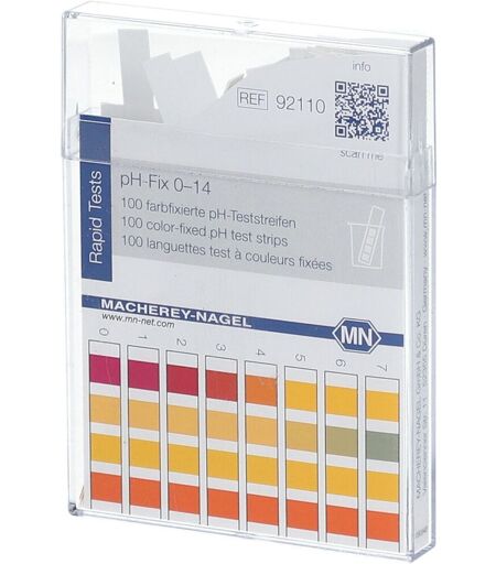 PH-FIX Indikatorstäbchen pH 0-14 Der pH-Wert einer Probe kann direkt vor Ort schnell und einfach bestimmt werden. Die Streifen sind jederzeit sofort einsetzbar. Farbkonstanz Kein Ineinanderlaufen der einzelnen Farbfelder Keine Verunreinigung der Probe durch die Indikatorfarbstoffe pH-Fix Produkte gekennzeichnet nach der IVD-Richtlinie 98/79/EG: pH-Fix 4,5–10,0 zur pH-Bestimmung von Harn, auch in Eigenanwendung pH-Fix 4,5–10,0 PT und pH-Fix 2,0–9,0 zur pH-Bestimmung von Magensaft pH-Fix 3,1–8,3 zur pH-Bestimmung von Speichel pH-Fix 3,6–6,1 und pH-Fix 3,6–6,1 PT zur pH-Bestimmung von Vaginalsekret pH-Fix Produkte gekennzeichnet nach der Medizinprodukterichtlinie 93/42/EWG: pH-Fix 3,6–6,1 und pH-Fix 3,6–6,1 PT zur pH-Bestimmung der Spüllösung nach der Desinfektion von Dialysegeräten ...
