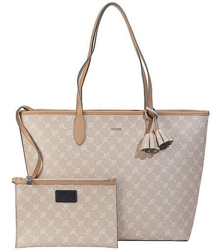 Damen Shopper aus Kunstleder Allover-Logomuster Zwei Henkel in Kontrastfarbe mit Anhänger Henkellänge: ca. 22 cm Hauptfach mit Reißverschluss Logo-Schriftzug auf der Vorderseite Innenfutter aus Baumwolle Herausnehmbares Täschchen mit Reißverschluss Logoplatte aus Plexiglas innen Maße: 32-41 x 29 x 17 cm (Breite im Verlauf x Höhe x Tiefe) Farbbezeichnung: Sesame Material: Lederimitat ...