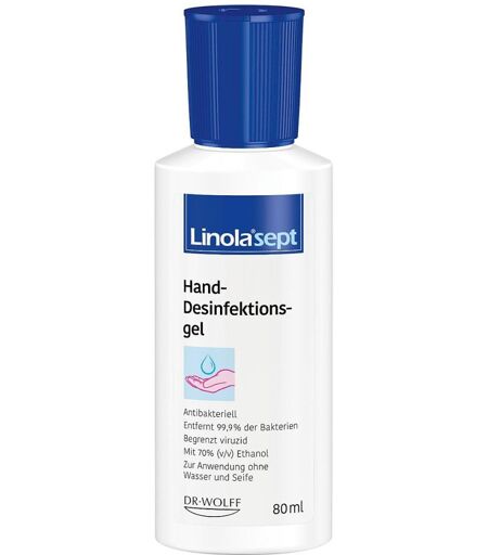 Anwendungsgebiet von Linola Sept Hand-DesinfektionsgelLinola Sept Hand-Desinfektionsgel mit 70 % (v/v) Ethanol entfernt 99,9 % aller Bakterien und inaktiviert behüllte Viren, wie Influenzaviren und Coronaviren (begrenzt viruzid).Wirkstoffe / Inhaltsstoffe / ZutatenInhaltsstoffe von Linola Sept Hand-Desinfektionsgel:
