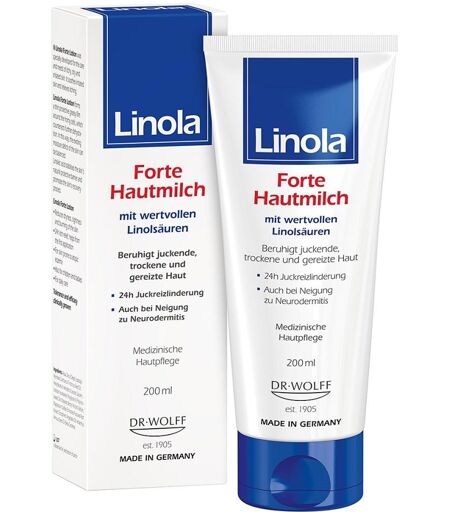 Anwendungsgebiet von Linola Forte HautmilchLinola Forte Hautmilch ist eine medizinische Hautpflege, die speziell für die Bedürfnisse juckender, trockener und gereizter Haut entwickelt wurde. Sie dient der Beruhigung irritierter Haut und zur Linderung von Juckreiz. Mit Linola Forte Hautmilch werden vorhandene Fett- und Feuchtigkeitsverluste der Haut wieder ausgeglichen. Die in Linola Forte Hautmilch enthaltenen Linolsäuren sorgen dafür, dass die natürliche Hautschutzbarriere stabilisiert wird und fördert den Erholungsprozess der Haut. Sie reduziert Trockenheit, Spannungsgefühle und Brennen der Haut. Linola Forte Hautmilch wurde für die tägliche Hautpflege trockener, gereizter und juckender Haut entwickelt. Sie kann auch für Babys und Kleinkinder angewendet werden.Wirkungsweise von Linola Forte HautmilchHäufige Begleitsymptome trockener Haut sind Spannungsgefühle, Juckreiz oder auch ein Brennen. Eine geschwächte Hautbarriere, die normalerweise die Haut vor Verlust von Feuchtigkeit schützt, tritt häufig als Ursache hervor. Die natürliche Schutzbarriere kann sowohl durch äußere Einflüsse (z.B. durch zu häufiges oder heißes Waschen) als auch durch innere Faktoren (z.B. Altershaut oder Neurodermitis) durchlässig werden. Linola Forte Hautmilch unterstützt die Haut den vorhandenen Fett- und Feuchtigkeitsverlust wieder auszugleichen. Wertvolle Linolsäuren stabilisieren den natürlichen Hautschutz und fördern so den Regenerierungsprozess der Haut. Trockene und gereizte Haut wird intensiv gepflegt. Linola Forte Hautmilch bildet einen dünnen schützenden Film um die Hornzellen aus. Dadurch wird Juckreiz bereits ab der ersten Anwendung reduziert.Wirkstoffe / Inhaltsstoffe / ZutatenInhaltsstoffe von Linola Forte Hautmilch: