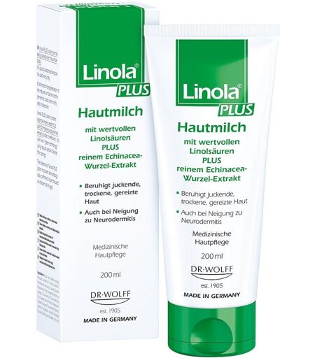 Anwendungsgebiet von Linola Plus HautmilchLinola Plus Hautmilch ist speziell für die tägliche Basispflege entwickelt worden und eignet sich vor allem für trockene bis sehr trockene, beanspruchte sowie zu Neurodermitis neigende Haut. Linola Plus Hautmilch verhindert ein Austrocknen der Haut und normalisiert ihren Fett- und Feuchtigkeitsgehalt.