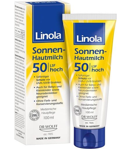 Anwendungsgebiet von Linola Sonnen-Hautmilch Lsf 50Linola Sonnen-Hautmilch Lsf 50 ist ein Sonnenschutz für empfindliche und neurodermitische Haut. Linola Sonnen-Hautmilch Lsf 50 schützt die Haut sofort vor UV-Strahlen. Sie verfügt über einen ausgewogenen und hochwirksamen UVA-/UVB-Filtersystem (LSF 50). Die Hautmilch lässt sich leicht verteilen und zieht schnell ein. Sie ist für Babys und Kleinkinder geeignet. Linola Sonnen-Hautmilch Lsf 50 ist frei von Farb- und Konservierungsstoffen und ohne Mikroplastik.Wirkstoffe / Inhaltsstoffe / ZutatenInhaltsstoffe von Linola Sonnen-Hautmilch Lsf 50: