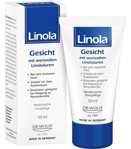 Wirkungsweise von Linola Gesicht CremeDie Linola Gesicht Creme schützt vor weiterem Feuchtigkeitsverlust. Sie hat einen beruhigenden Effekt auf die Haut und fördert die natürliche Regeneration der Hautbarriere. Der hohe Gehalt an pflanzlichen Lipiden macht die Linola Gesicht Creme auch für sehr trockene und zu Neurodermitis neigende Haut sehr gut nutzbar. Linola Gesicht Creme ist abgestimmt auf die speziellen Pflegebedürfnisse sehr trockener, juckender oder gereizter Hautzustände. Die Creme ist frei von Farb- und Konservierungsstoffen, Mineralölen, Silikonen und Mikroplastik und auch bei empfindlicher Haut gut verträglich. Linola Gesicht Creme verfügt über einen hohen Linolsäure-Gehalt. Linolsäure ist für eine intakte Hornschicht, die als Barriere die Haut u. a. vor übermäßigem Wasserverlust und Austrocknung schützt, unbedingt erforderlich. Unser Körper kann Linolsäure nicht selbst produzieren, weshalb er von außen benötigt wird. Außerdem besitzt die Linola Gesicht Creme eine Wasser-in-Öl-Emulsion, die die fettspendenden Komponenten liefert und sich die Creme somit auch für neurodermitische Haut besonders eignet und sowohl dem Fett- als auch Feuchtigkeitsmangel der Haut entgegenwirkt. Dies unterstützt die Normalisierung der trockenen und auch zu Juckreiz neigenden Haut.Wirkstoffe / Inhaltsstoffe / ZutatenInhaltsstoffe von Linola Gesicht Creme: