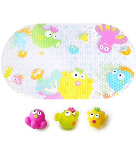 Das Set für den garantierten Badespaß. Badematte inkl. 3 süßer Wasserspritztiere sind ein muss für alle Badefans. Die bunten Farben und lustigen Designs kommen nicht nur bei kleinen Bademeistern an - mit den Escabbo-Badetieren wird jeder seine Freude haben. Die Tierchen sind innen hohl und lassen sich kinderleicht mit Wasser füllen - das Entleeren ist dann der größte Spaß! Escabbo ist es wichtig, dass die Produkte selbst für die Kleinsten geeignet sind. Deshalb riechen die Tiere nicht und es löst sich auch keine Farbe ab. Aufgrund der Formen und Farben werden Kinder zum Greifen und Spielen animiert - das fördert die Motorik und den Tastsinn. Die Plantsche-Tiere werden wahrscheinlich nicht lange im Bad bleiben, denn sie erweisen sich überall als lustiges Spielzeug. Ihre Kinder und Sie werden begeistert sein! Pflegehinweise: keine scharfen Reinigungsmittel verwenden, Seifenlauge reicht zur Reinigung aus. In der Nähe der Heizung komplett austrocknen lassen, bevor sie verstaut werden - so haben Sie lange Spaß an den Tierchen. Abmessungen Matte: 69 cm x 39 cm; Spritztiere: Durchmesser ca. 6 cm ...