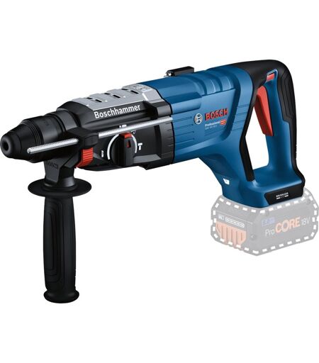 Der Bosch Akku-Bohrhammer GBH 18V-28 D Professional liefert mit 3,4 Joule Schlagenergie aus dem wartungsfreien bürstenlosen Motor und einem optimierten Leistungs-Gewichtsverhältnis von 1,1 J/kg sogar eine stärkere Leistung als der kabelgebundene GBH 2-28. Der einfach zu bedienende große Schalter und der D-Handgriff, der sich besonders beim Meißeln und beim Bohren vertikal oder abwärts als praktisch erweist, sorgen für bequemes Arbeiten. Die integrierte LED-Lampe erhellt dabei auch dunkle Stellen. Außerdem verfügt der GBH 18V-28 D Professional über einen Zusatzhandgriff und einen Tiefenanschlag. KickBack Control erkennt einen plötzlichen Verlust der Werkzeugkontrolle, wenn sich z.B. der Bohrer verkantet und schaltet den Bohrhammer ab, um das Risiko für Hand- und Armverletzungen zu verringern. Der Griff mit Vibration Control sorgt zusätzlich für erhöhten Anwenderschutz. Der Akku-Bohrhammer GBH 18V-28 D Professional eignet sich zum Bohren und Meißeln in Beton und Mauerwerk. Für äußerst komfortables, staubfreies Bohren kann der extrem leichte Sauger GDE 28 D Professional (nicht im Lieferumfang enthalten) mit Filterreinigungsmechanismus für konstante Saugkraft direkt am Bohrhammer befestigt werden. Der GBH 18V-28 D Professional besitzt einen Werkzeughaken, mit dem er in Pausen aufgehängt werden kann. Die benötigten Akkus sind Teil der AMPShare Alliance. Ein einziger Akku passt für alle Werkzeuge und Maschinen im blauen Bosch Professional 18V System, kann aber auch markenübergreifend mit zahlreichen weiteren Geräten anderer Hersteller aus der AMPShare Alliance verwendet werden. Nie mehr neue Akkus für jedes neue Werkzeug kaufen, nie mehr nach dem "richtigen" Akku suchen, mit AMPShare reicht ein Akku für alle Arbeiten. ...